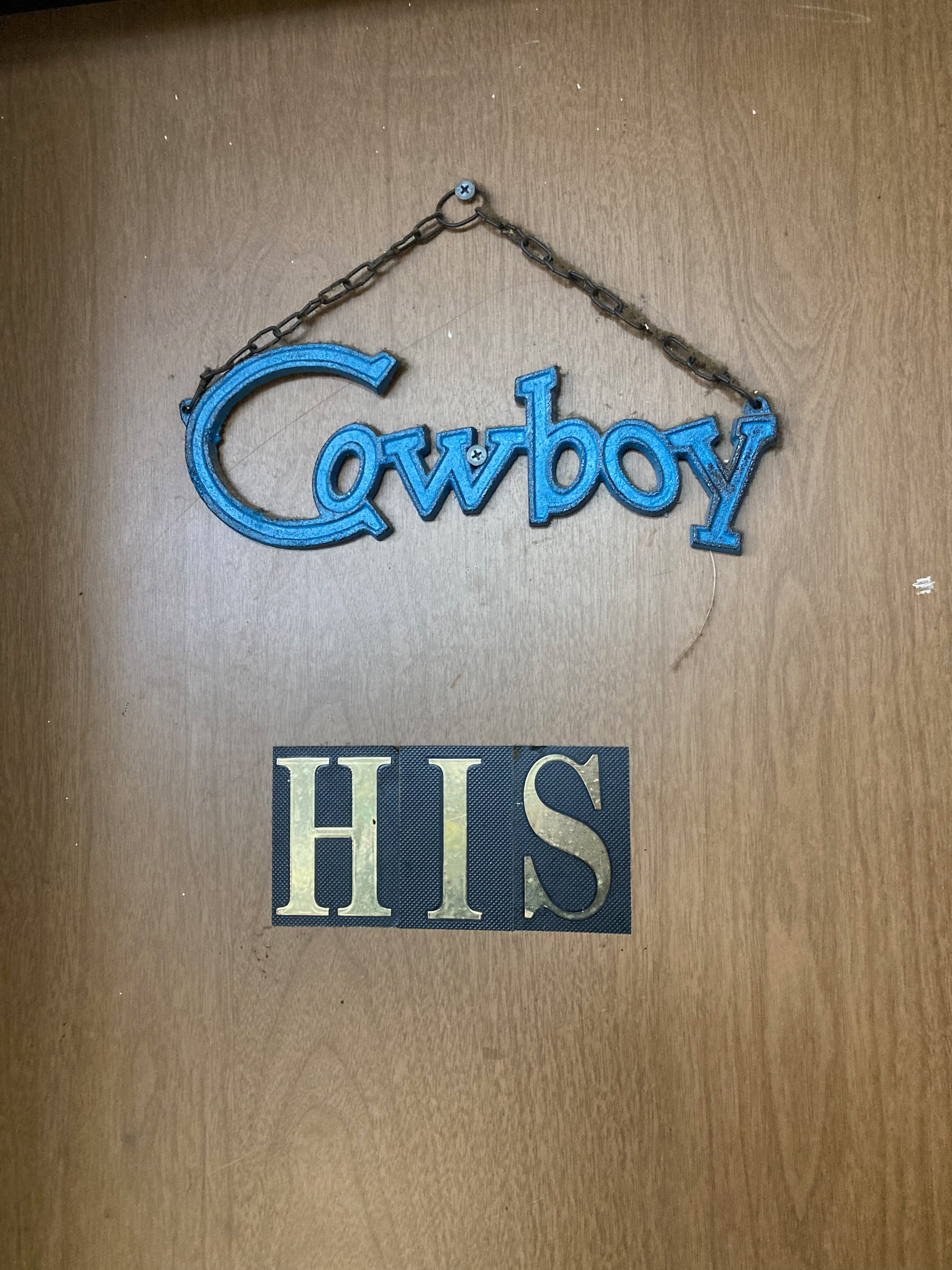 The men’s room was in fact grimy, but very private (!), festooned as it was with a quaint “cowboy” plaque and stick-on letters.