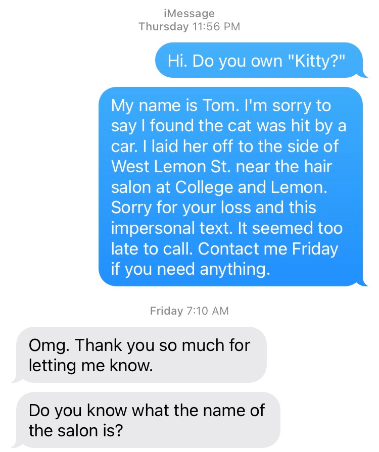 Despite being hit by a car, her collar lay beside her, intact, as sometimes precious mementos find their way to earth after a tornado. It was made of thin, faux leather and displayed the owner’s phone number and “Kitty.” As first responder, I couldn’t hold a long vigil, but I paused in silent blessing before texting the owner.