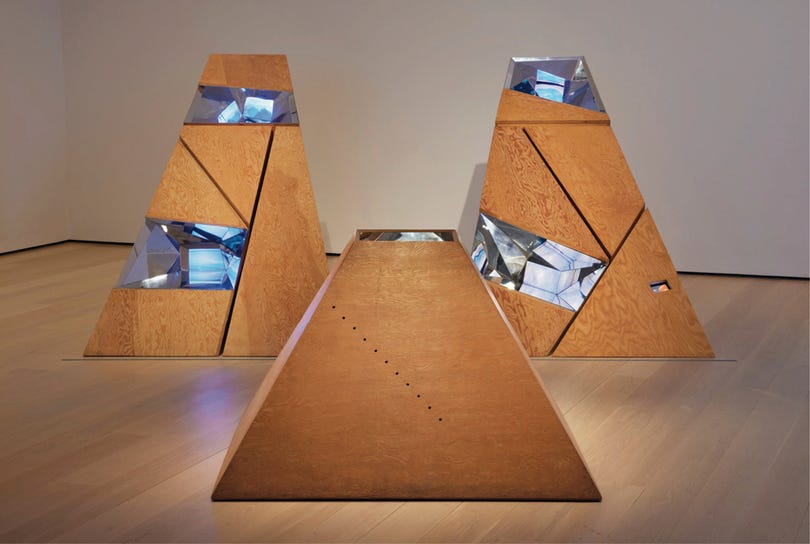 Her sculptures, hanging or at floor level, combine TV screens and ersatz wood-working projects into 3-D sculptures.