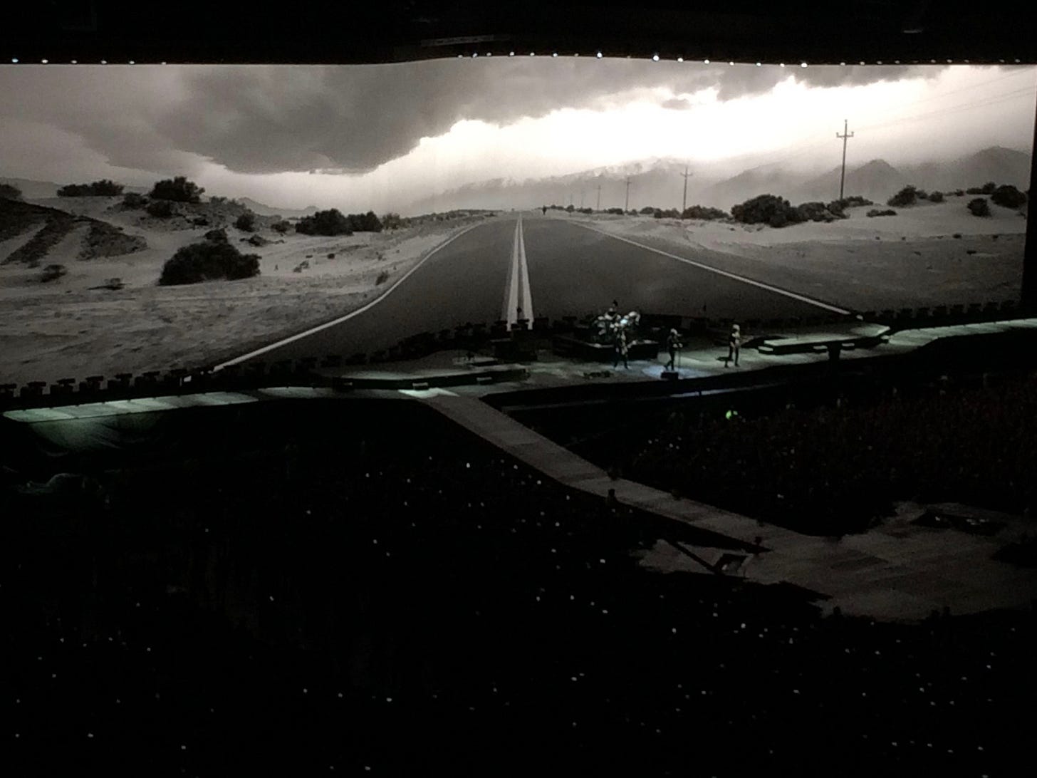 That night U2 played every song from their Joshua Tree record, celebrating 30 years of its impact. High-def films plastered their backdrop, seamlessly: Driving shots on two lane roads in American deserts, staring hitchhikers emerging from the scruff, and vanishing points ending in turbulent skies.